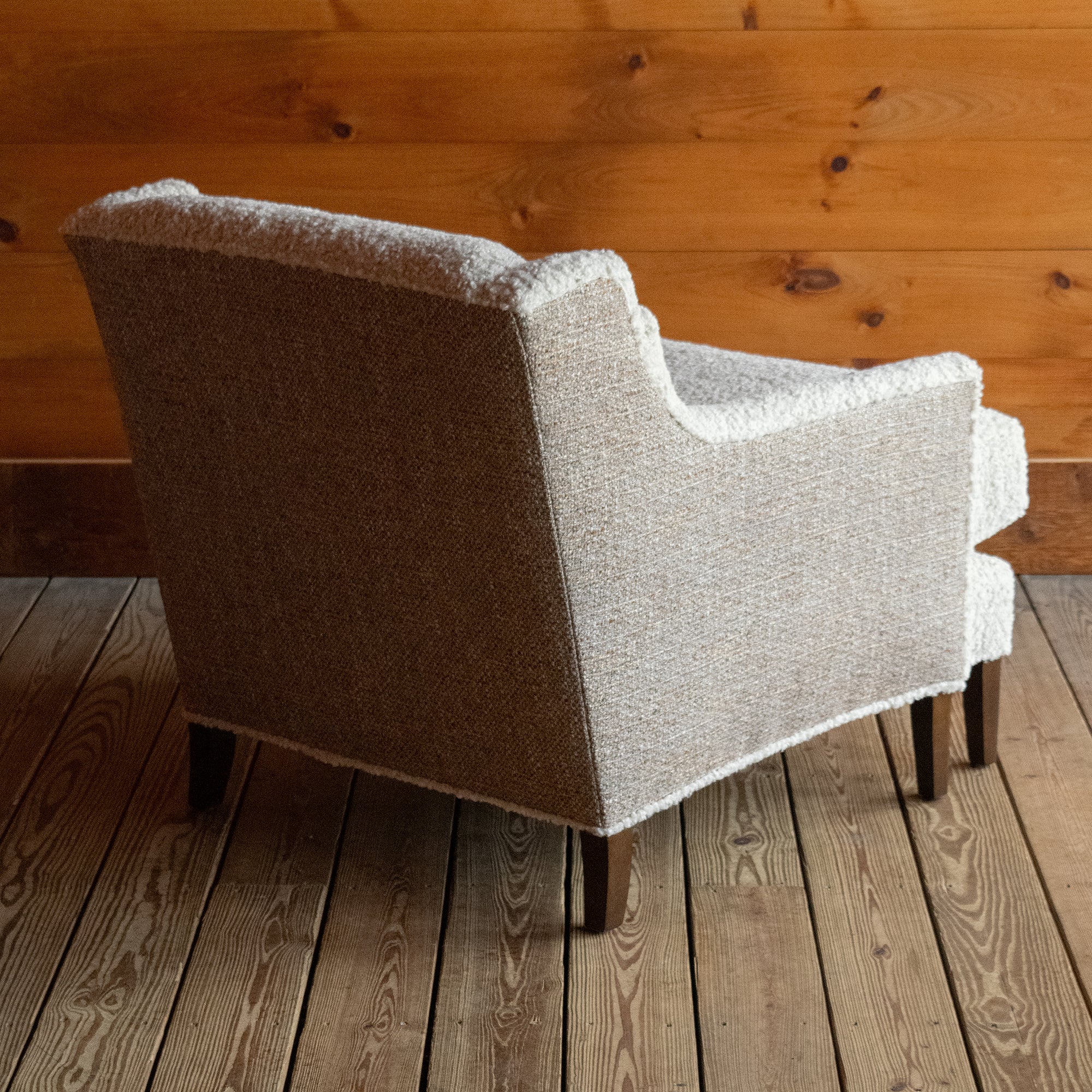 • Angled back view of a tight back faux shearling chair on a wide-plank wooden floor against a rustic wooden wall