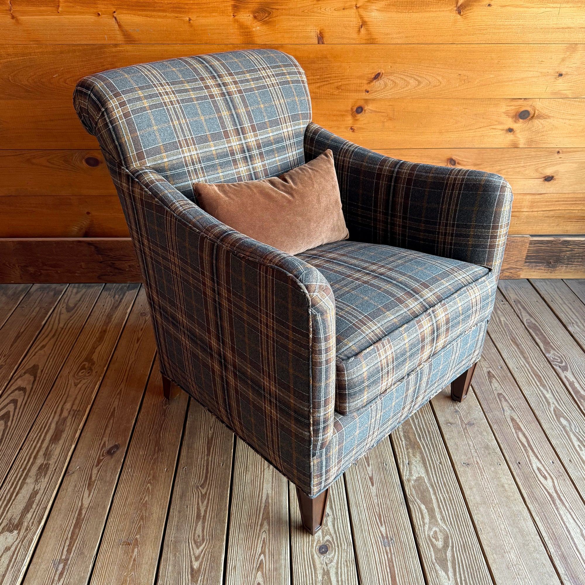 The Calhoun Chair: classic, cozy, and inviting. Its tight back design is covered in a classic plaid fabric, bringing warmth and texture to any rustic space. The traditional rolled back and curved arms are elegantly pleated, while the seams are meticulously trimmed in welt for a refined finish. Coordinating tapered wooden legs complete the look.