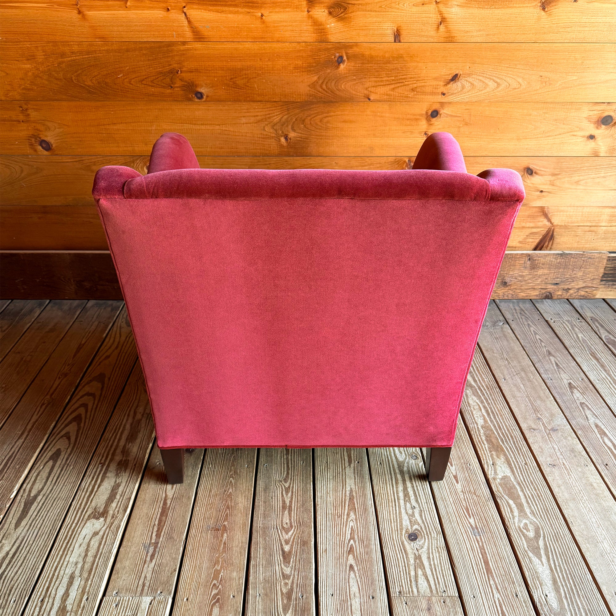 The Evolution Chair brings warmth and character to any space. Gently flared arms create a distinctive silhouette, while the rich red performance velvet offers both softness and durability. Designed to withstand daily use, this fabric will keep its velvety feel and timeless look for years to come. Its tailored tight back is paired with a matching kidney pillow, offering additional comfort and lumbar support. Tapered wooden legs complete the look.
