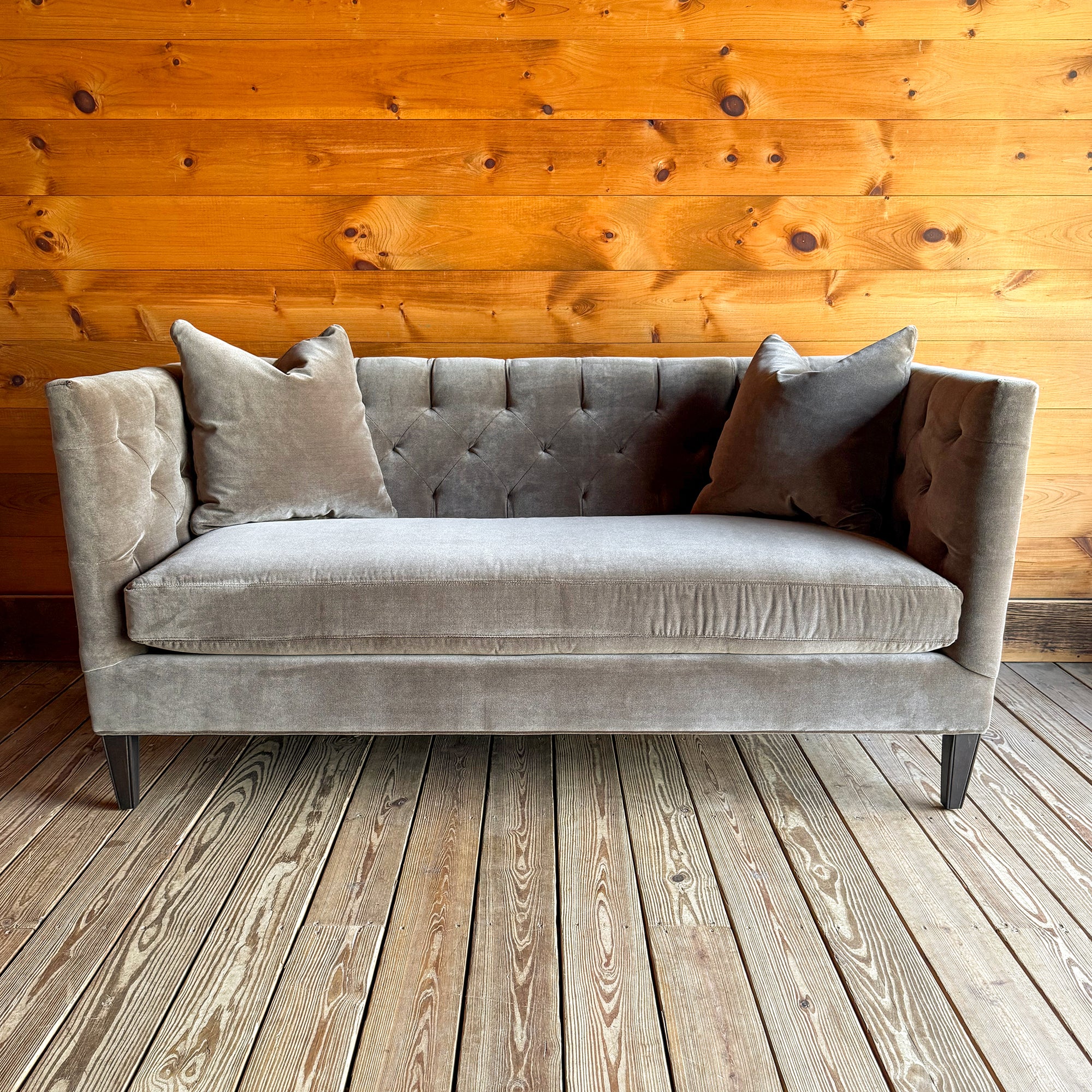 If you’re searching for the perfect sofa for a small space, the 69-inch Kiwassa Tufted Sofa combines comfort with timeless style. Upholstered in soft velvet, its supportive shelter-arm design and bench seat cushion invite hours of relaxation. Crafted with a hardwood frame, eight-way hand-tied springs, and tapered wooden legs, this sofa is sure to stand the test of time. Two matching throw pillows complete the look.