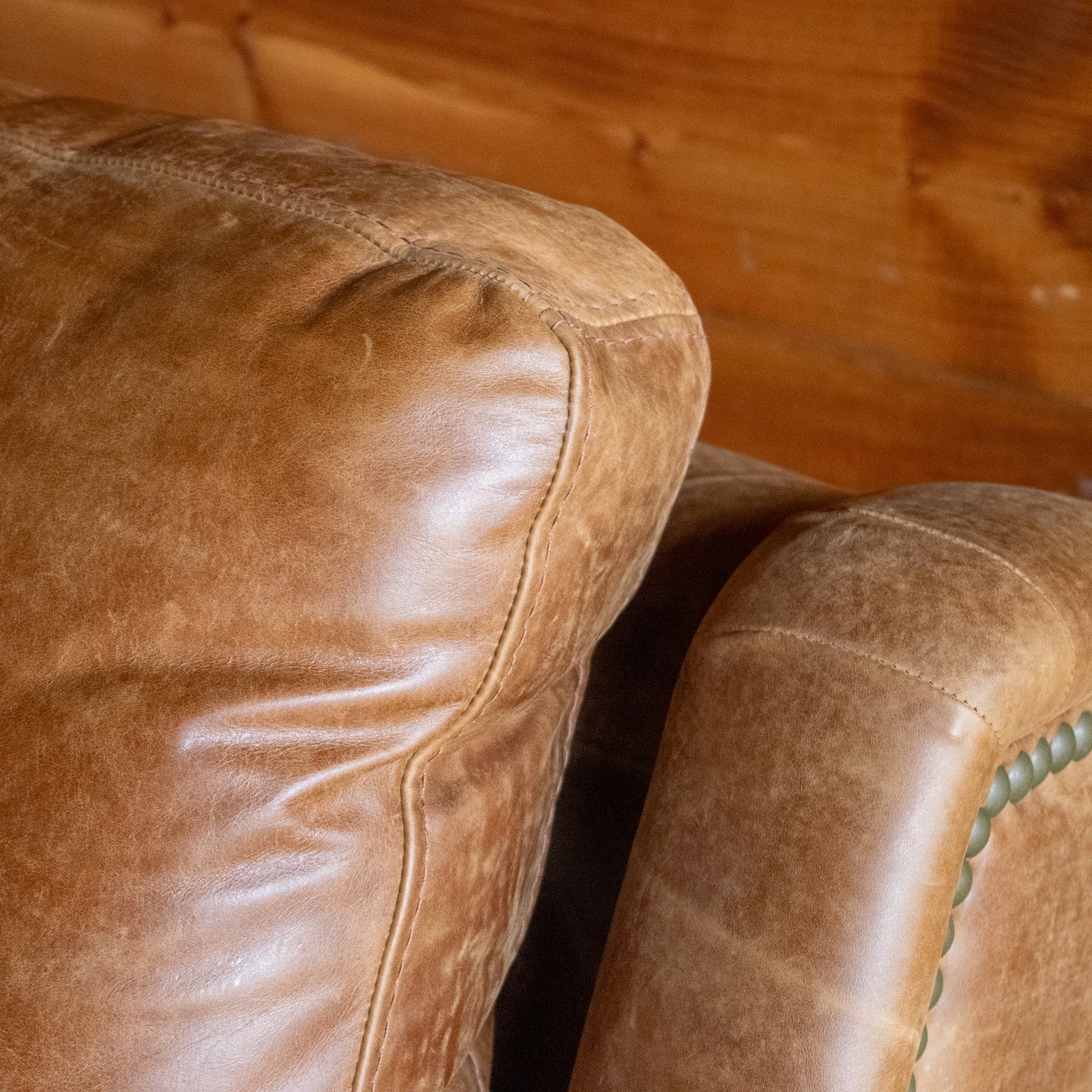 Designed with a push-back mechanism, the Outland Leather Recliner invites you to lean back, kick your feet up, and relax. Supple European nubuck leather upholstery offers a velvety, suede-like hand with a gently worn appearance, while its boxy silhouette exudes masculine appeal. Carefully placed decorative nailhead trim highlights the chair’s clean lines and lends handcrafted charm. Tapered wooden legs complete the look.