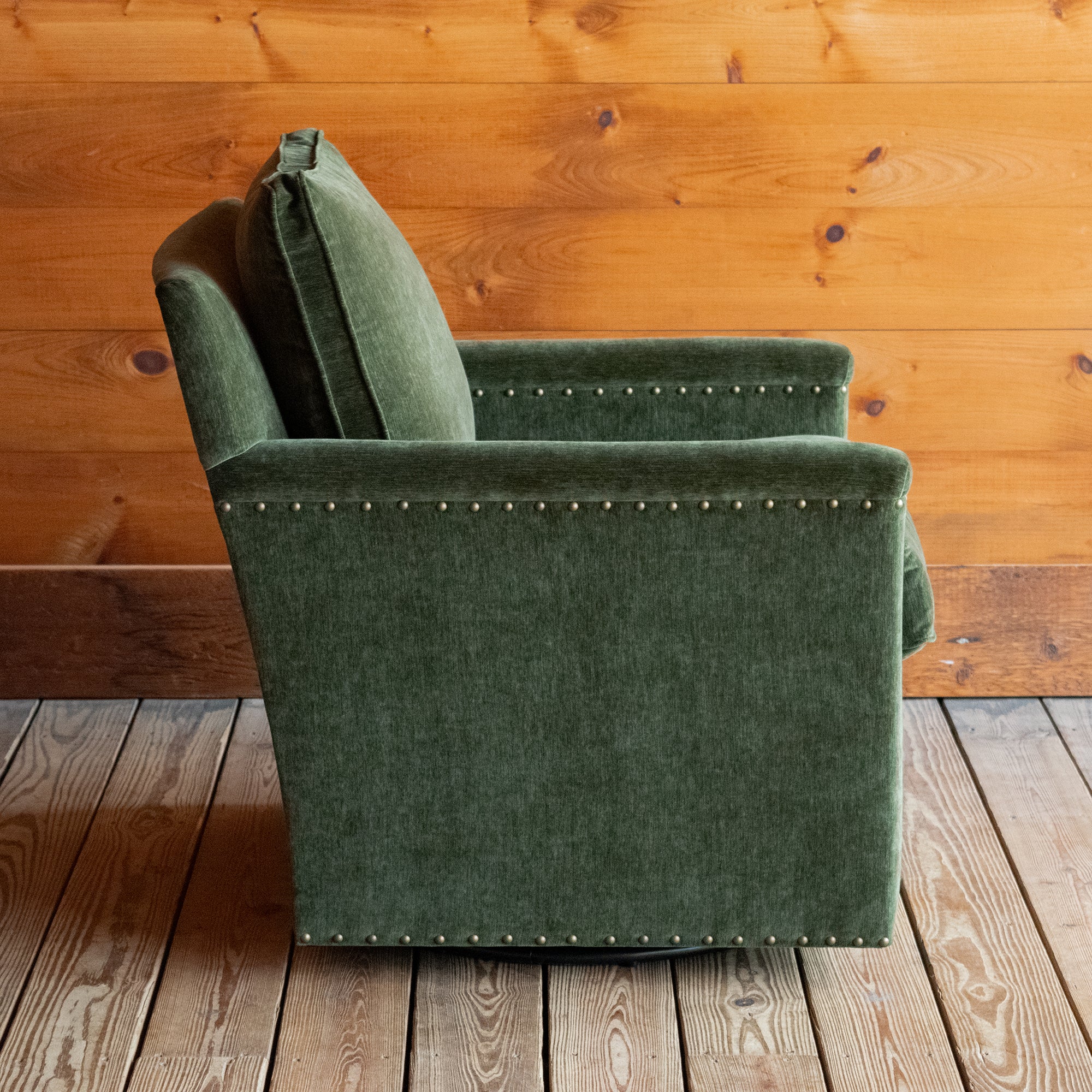 Stay connected with everyone in the room without leaving your seat! The Placid Swivel Chair’s hidden swivel base offers versatility, while its clean lines and track arms create a timeless silhouette. Upholstered in the rich, velvety Everest Forest, this luxurious green fabric is soft yet durable enough for everyday use. Welted cushions and rustic nailhead trim complete the look.